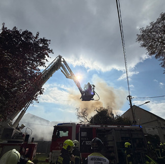 Bereits während der Anfahrt war eine Rauchsäule sichtbar. Um die Brandbekämpfung möglichst effizient zu gestalten, wurde unser Steig auf der Rückseite des Hauses in Stellung gebracht, um den Außenangriff von oben zu unterstützen.